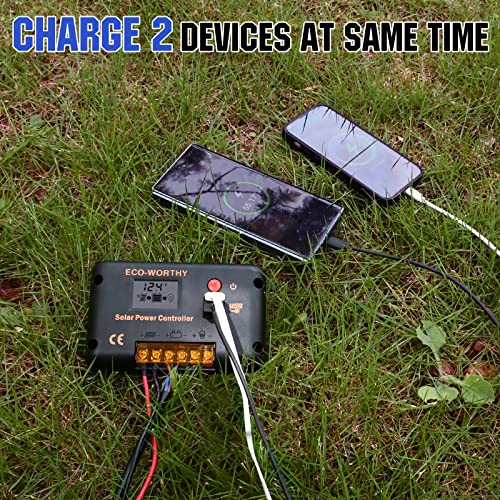 Bescherming van de batterijlading: 20A LCD-controller kan Lithium/Gel/Lead zure batterij beschermen tegen overbelasting en kortsluiting tijdens het opladen, 5V USB-poorten voor telefoons, tablets.