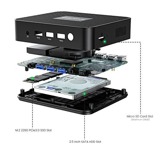 【Expand Storage Design】 Deze mini pc is uitgerust met eMMC 64GB (aan boord). Als u zich zorgen maakt over het opraken van de capaciteit, is het uitbreidbaar met de toevoeging van M.2 2280 PCIe3.0 SSD slot en 2,5 inch SATA HDD slot (SATA 3.0 6.0Gb/s) gemonteerd in de top cover.Tegelijkertijd kunt u een micro SD-kaart (tot 128GB). Krijg meer opslagruimte voor uw favoriete video’s, foto’s of andere gegevens. Vertaald met
