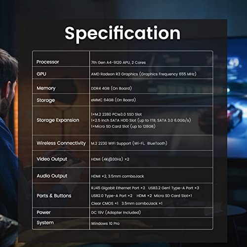Specification: Mini PC 7e Gen AMD A4-9120C APU, AMD Radeon R3 graphics met 4GB DDR4 64GB eMMC Windows 10 Pro Mini Computer Dual HDMI…