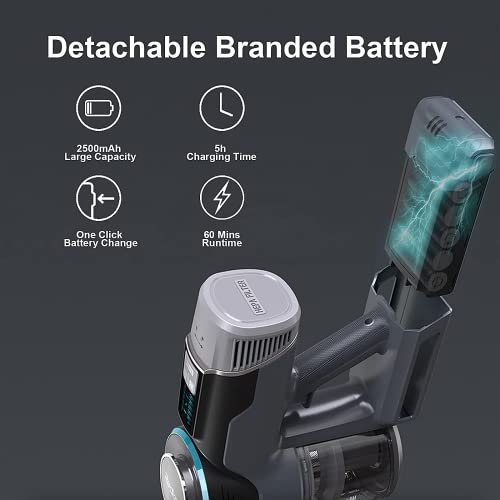 Vervangbaar batterijdesign: deze draadloze stofzuiger is uitgerust met een uitneembare en verwisselbare 2500 mAh batterij met hoge capaciteit, die een reinigingstijd van maximaal 60 minuten mogelijk maakt. Het duurt slechts 5 uur. kan aan de muurbeugel worden opgeladen, of je kunt de accu eruit halen en hem apart opladen. (Door de aankoop van een reservebatterij kun je een langere reinigingsduur bereiken.)