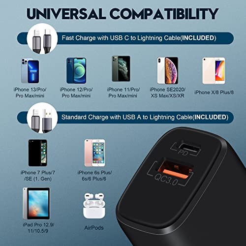 ONTWORPEN OM APPELS TEGELIJKERTIJD OP TE LADEN: Deze oplader met 2 poorten wordt geleverd met 2 Lightning-kabels, de ene is een USB-C naar Lightning-kabel en de andere is een USB-A naar Lightning-kabel. Hij kan eenvoudig worden aangesloten op de Lightning-poorten en laadt twee Apple-apparaten tegelijkertijd op.